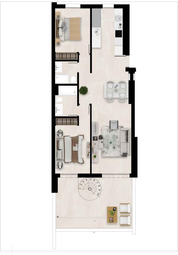 Construction project: Luxurious 2-bedroom penthouse, first line of golf, Estepona New residential complex with 2 and 3 bedroom apartments with panoramic views of the golf course and some homes also of the sea. The apartments have very bright rooms thanks to their south and southwest orientation. The residential area and the golf course are perfectly integrated, within a natural environment with a spectacular landscape. Apartments with large terraces. Closed and private urbanization with gardens and community pool. It stands out for its construction quality, as well as for the new luxury materials and design of its finishes. All homes have spectacular panoramic views of golf, the coast and the mountains. Large terraces with two orientations to choose from: southwest and east. Private residential with community pool and gardens. High quality finishes in accordance with European construction standards. Designer kitchen equipped with ceramic hob, oven and refrigerator. Fully equipped bathrooms, including screen and mirror. Air conditioning with air conditioning, solar panels, thermal and acoustic soundproofing, natural ventilation system. Private surface parking space with pre-installation for an electric vehicle for each home. Type B energy certificate.