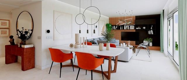 Apartments in new phase for sale in La Cala Golf, Mijas Costa consisting of a lounge, 3 bedrooms, 2 bathrooms, a fully fitted kitchen and a terrace of 29m2. Exterior private parking. Communal pool and gardens. Golf and mountain views. Quiet area. Sport facilities include 3 golf courses, tennis, football, fitness room, and Spa. New phase for sale. Owners will get Privilege Card. Completed October 2026.