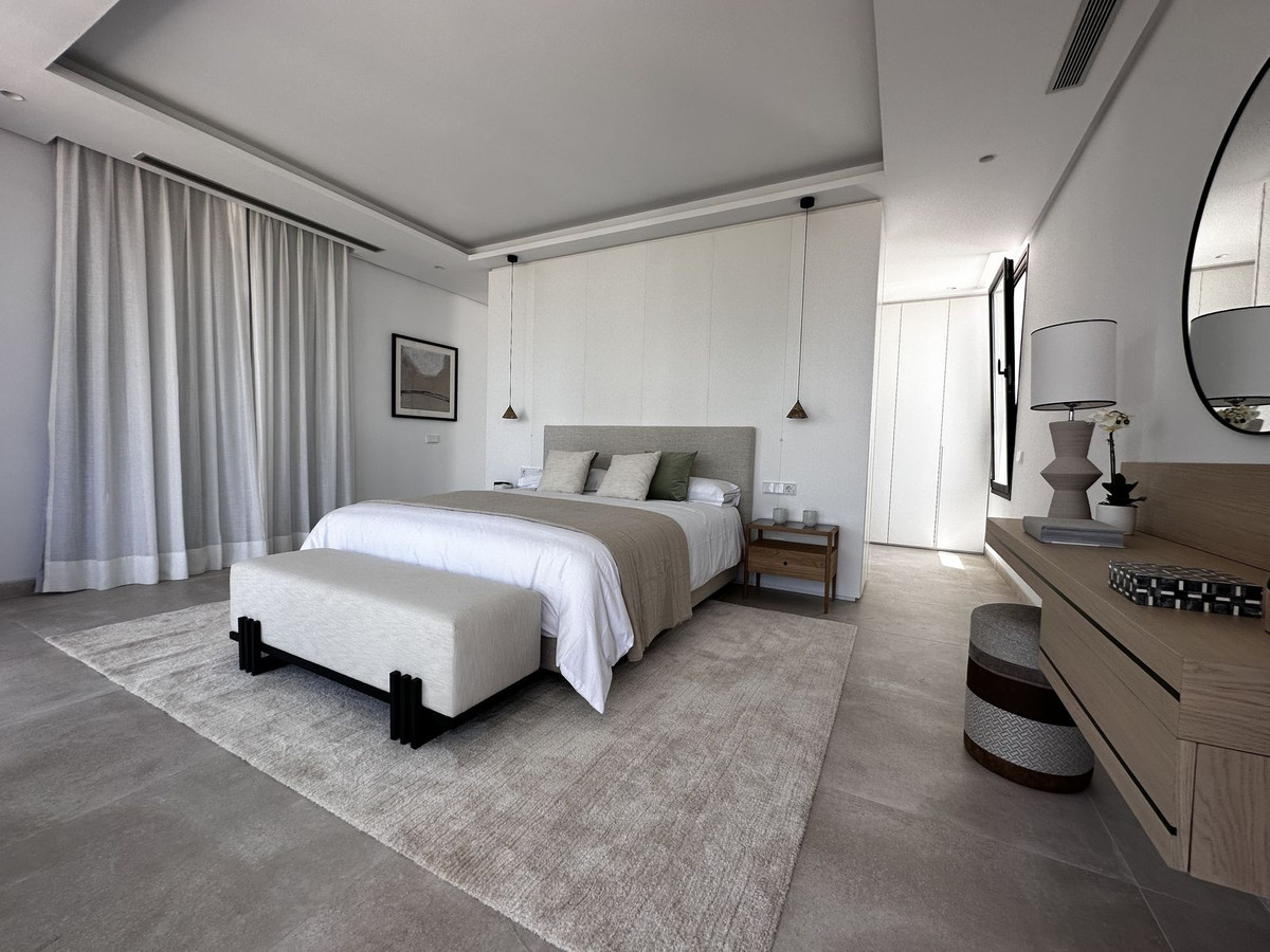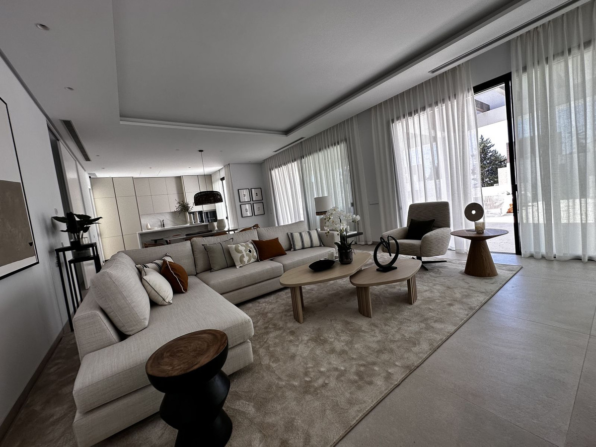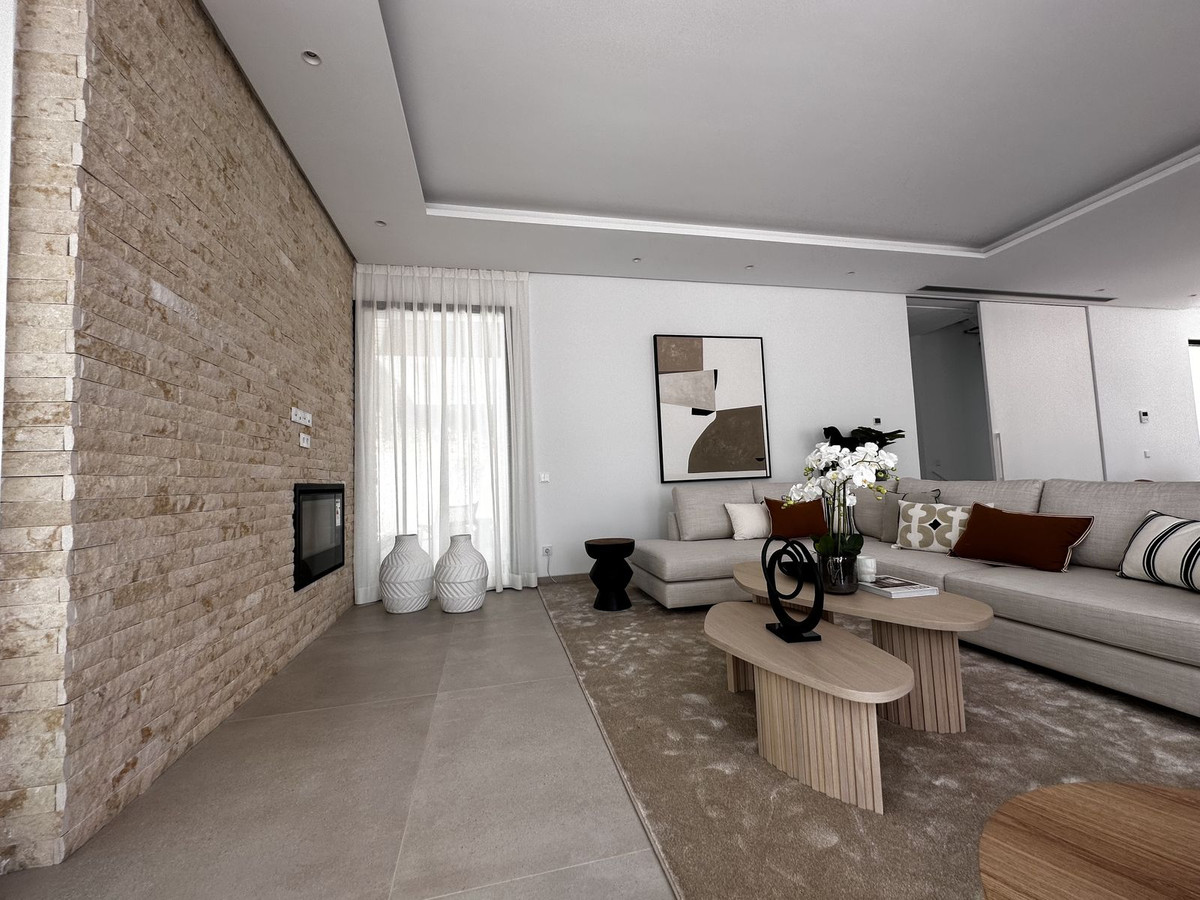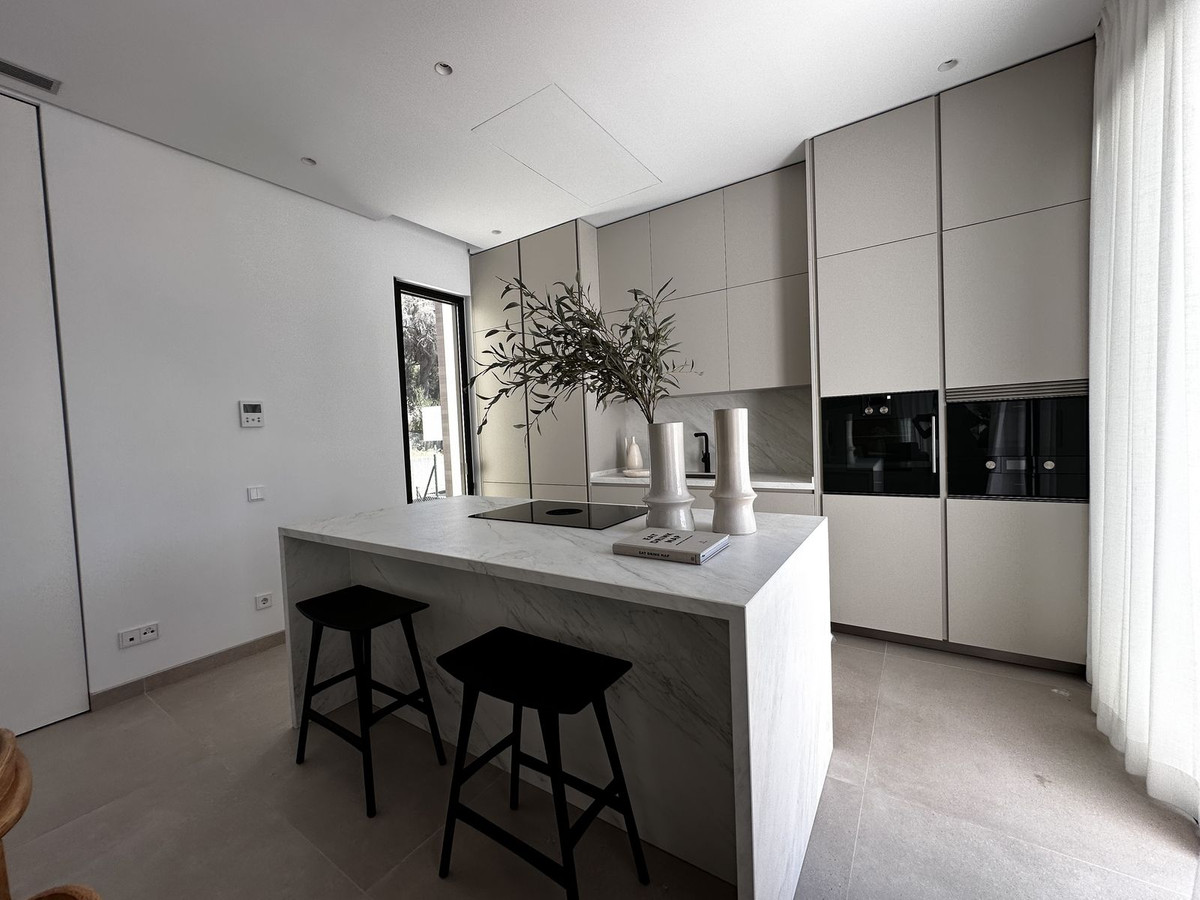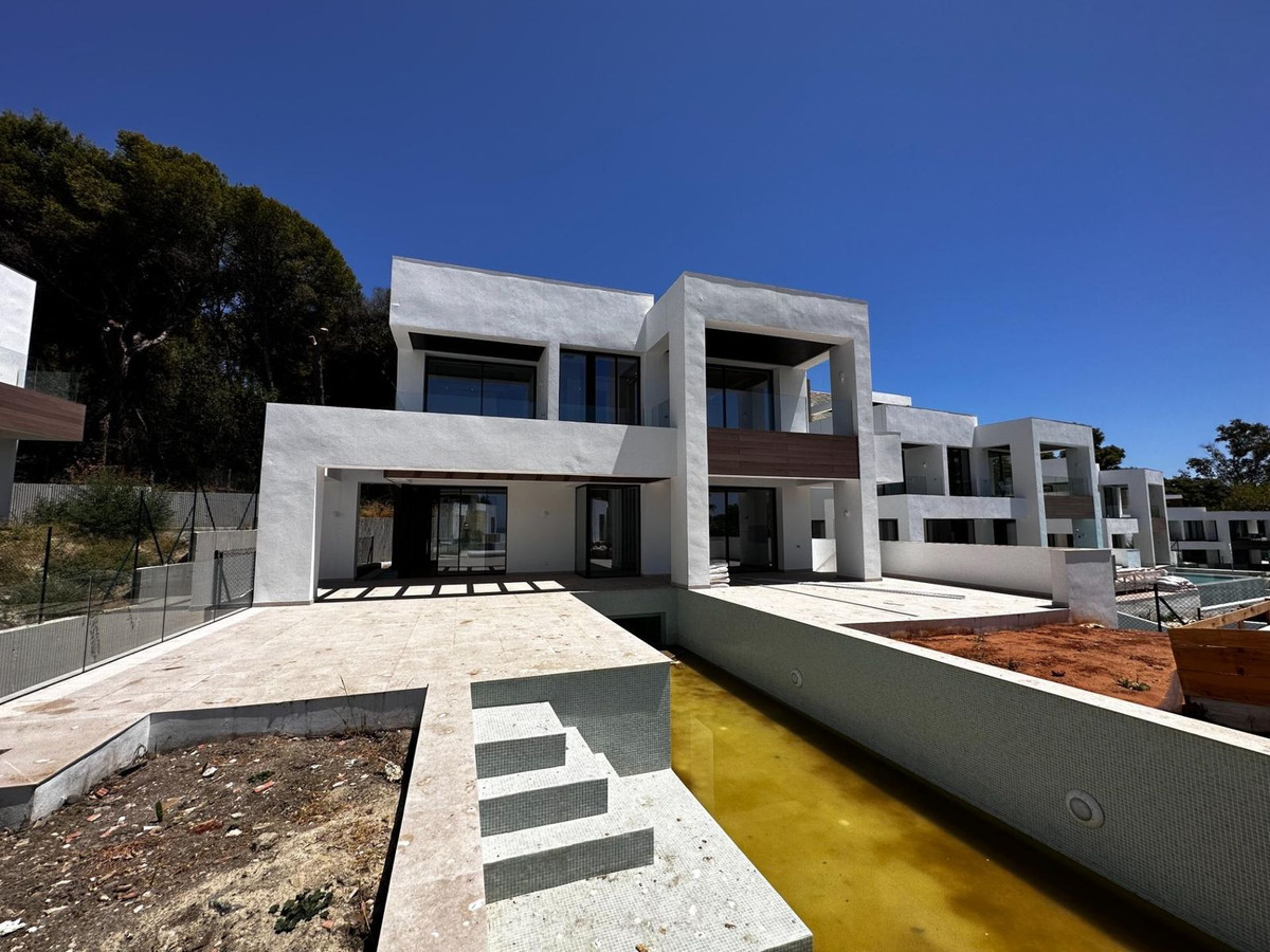 Modern luxury villa of exceptional qualities is located in a gated community, consisting of only 15 villas, with 24 hour security guards and concierge services situated in a green oasis on the edge of the famous Golden Mile and just a few metres from the beach, a few minutes walk from the historic old town. With a plot of 1000m2, a total living area of 730m2, large terrace of 225m2 and includes 5 bedrooms and 5 bathrooms, a spacious living room, an open plan kitchen equipped with the highest quality furniture and appliances, a private lift connecting each level of the property, cinema, sauna and hammam, under floor heating, a rooftop solarium with beautiful views towards the sea and private garage for 2 cars + 2 parking spaces. Both the garden and pool will be centrally maintained by the community for a carefree lifestyle. Construction of the villa is finished.