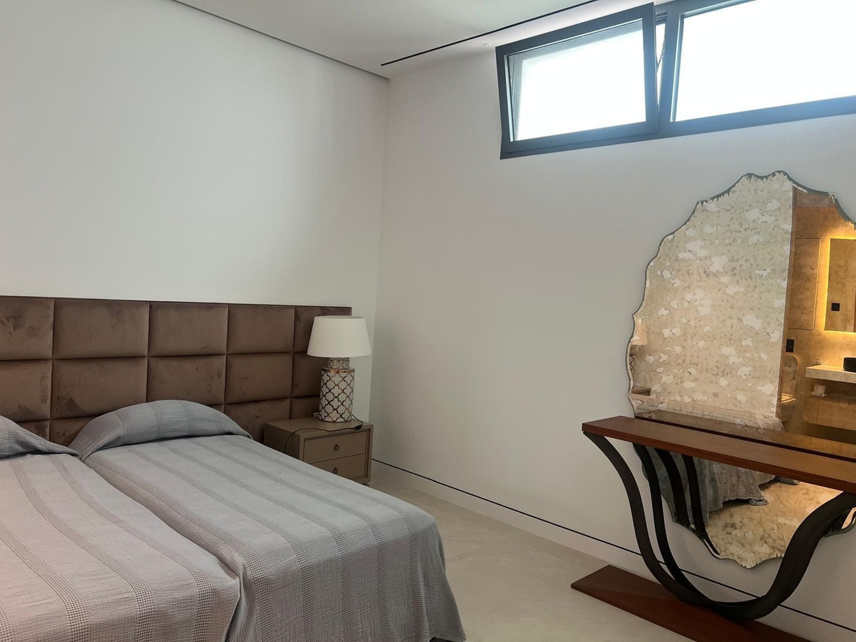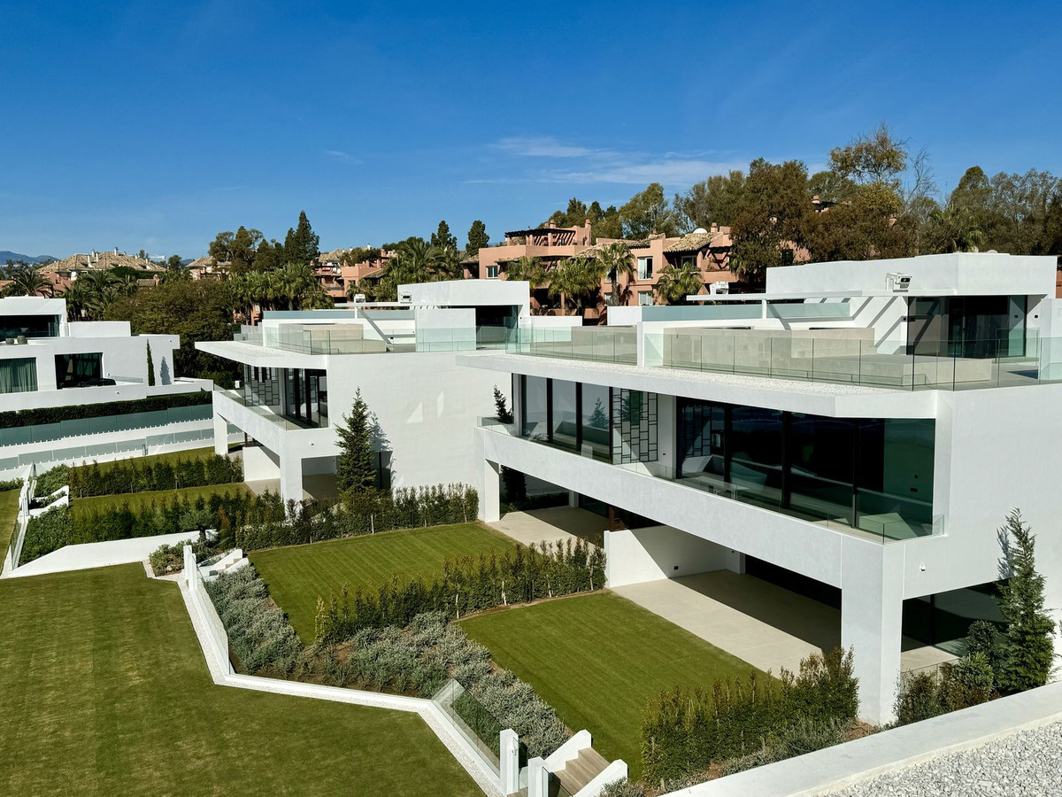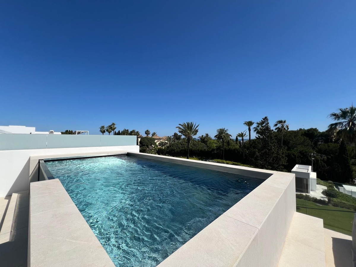 Brand new Villa located in a heart of Nueva Andalucia, Marbella. Walking distance to Puerto Banus and all amenities, close to Aloha Golf Club & Las Brisas Golf Club, and just 1,5 km from the beach. Houses were built in 2024. The residential is completely gated and private, counting with a spectacular entrance, which gives access to 6 impressive “Vilas” with state-of-the-art design. Within the entrance we can find the reception and the security guard post. The extensive outdoor spaces and gardens around the “Vilas”, give way to a new concept of swimming pool of almost 180 m2 plus a 36 m2 children’s pool, both with chlorination water treatment. The beautifully built Villa on 4 levels offers high quality, stylish and bright living room open to the large and elegant terrace. All 3 bedroom suites include floor-to-ceiling windows, a sleek minimalist kitchen. All 4 levels are connected by a modern elevator. Terraces leading out to a private area of garden – as well as having access to the beautifully landscaped communal gardens and swimming pool. Roof terrace with private swimming pool and outdoor cinema. A customizable basement provides ample space for a home gym, an additional bedroom or room for any other use, such as an office. Villa 6.6 has a parking space for 4 cars within the communal underground parking area. Due to its orientation and position, the entire complex enjoys natural light most of the day, and Villa is completely filled of luminosity through its incredible windows as well as through the “Central courtyard”. It is also a fact that the residents will be able to enjoy the most incredible sunrises and sunsets from the spacious terraces.