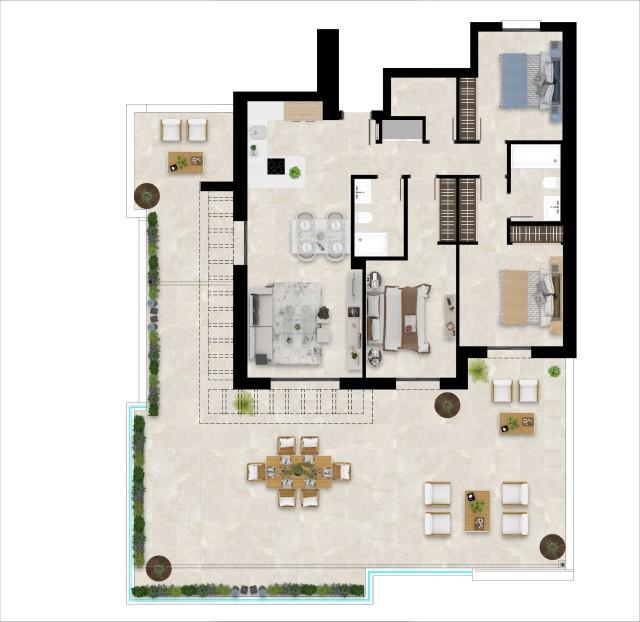 Contemporary style 3 bedroom penthouse in Casares Costa A private residence that offers a total of 58 apartments with 2 and 3 bedrooms, distributed in 4 buildings, offering the possibility of choosing between a ground floor with a garden, a first floor with sea views, or exclusive 3-bedroom penthouses with huge terraces with panoramic views of the Mediterranean Sea… All the houses are oriented to the southeast towards the sea and have large terraces to make the most of the light. All the ground floors also enjoy a garden for private use. The residential has large garden areas for the enjoyment of families with a designer community pool. The bright homes stand out for their large terraces with impressive views of the sea. All the houses have a private parking space in an outdoor community parking lot, covered by a community pergola. It is located just 5 minutes from Playa Ancha, with direct pedestrian access to its fine sand, next to the access to the Doña Julia Golf clubhouse, and just 4 minutes by car from San Luis de Sabinillas and Manilva, where you can enjoy the best gastronomic, commercial, sports and leisure offer in the area.
