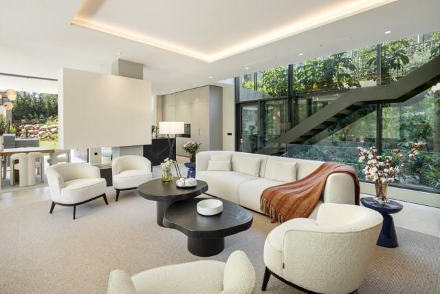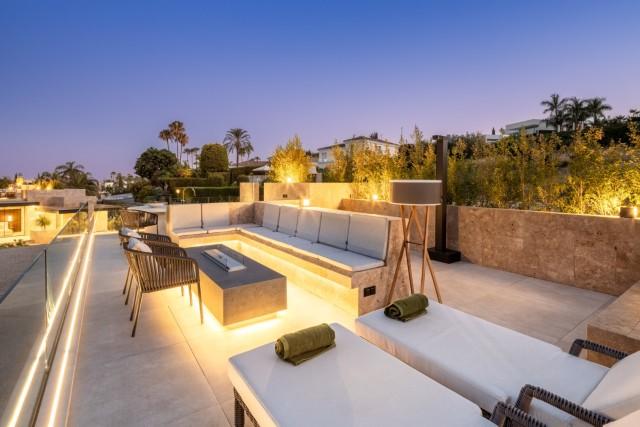 Stunning Brand New Modern Villa for sale in Nueva Andalucia Marbella. This gorgeous real estate is located in one of the most thought after areas in Marbella, surrounded by top golf courses and Puerto Banus just a few minutes away. The villa is crafted from natural materials to blend seamlessly with the surrounding landscape, creating an oasis enveloped in lush greenery. The ground floor includes a living room, open-plan kitchen, dining room, TV room/office, and one en-suite bedroom. This floor extends effortlessly to the terraces, featuring an outdoor kitchen, living area, dining area, and pool area. The first floor boasts a master bedroom with a walk-in closet and two additional en-suite bedrooms. The rooftop terrace offers seating areas, a fire pit, a jacuzzi, and provisions for another outdoor kitchen. The basement includes a TV room with pre-installed kitchenette connections, providing extensive customization options. It also hosts a games room, gym, spa with a sauna and Hammam, one en-suite bedroom, and an additional bedroom/office that shares a bathroom with the gym area. The basement’s bedroom and TV room come with pre-installed kitchenette connections, offering further customization options. The villa allows for flexible remodeling of the top floor to suit your preferences. Embrace sustainable living with pre-installed solar panels on the sundeck and enjoy the convenience of user-friendly home automation, accessible through a single app on your phone. Revel in comfort with zoned floor heating and indulge your culinary desires with Gaggenau kitchen appliances. Elevate your bathing experience with faucets and sanitary ware from Villeroy & Boch and Grohe, and relax in infinity pools with salt chlorination. The villa also features seamless technology integration, with pre-installations for curtain motorization and various TV placement options in designated entertainment spaces. Designed with convenience in mind, gardeners can access equipment rooms without entering the villas, ensuring privacy and efficiency. This beautiful villa offers flexibility in configuring the top floor to suit individual preferences. The villa is fully furnished, with all furniture included in the price.