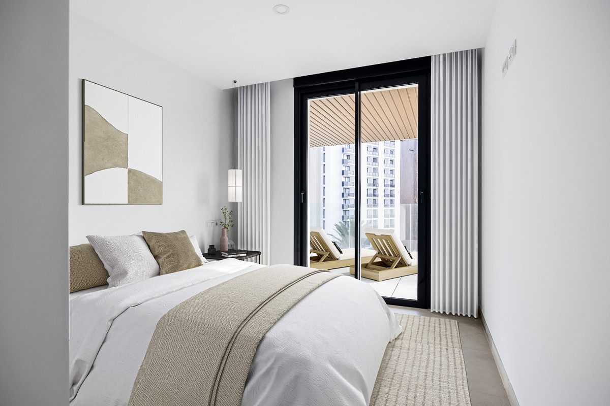 Setting: Beachside, Close To Port, Close To Shops, Close To Sea, Close To Town, Close To Schools Orientation: East Condition: New Construction Pool: Communal, Indoor Climate Control: Air Conditioning, U/F/H Bathrooms Views: Sea, Mountain, Pool, Urban Features: Lift, Fitted Wardrobes, Gym, Sauna, Storage Room, Ensuite Bathroom Furniture: Not Furnished Kitchen: Partially Fitted, Kitchen-Lounge Garden: Communal Security: Electric Blinds Parking: Private Category: Luxury