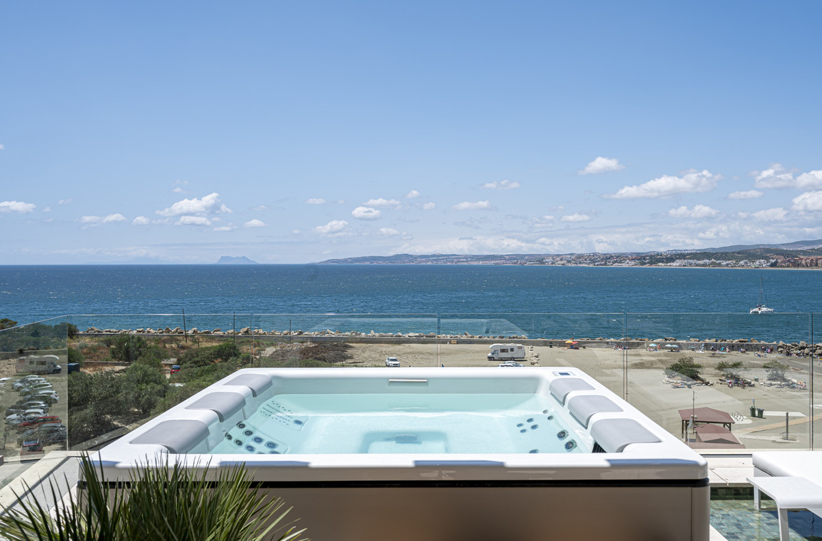 Located in the highly sought-after Playa del Cristo area of Seghers, Estepona, this luxurious beachfront apartment epitomises modern living with a touch of coastal elegance. Offering uninterrupted panoramic sea views, this newly constructed property, completed in 2024, combines prime location with state-of-the-art amenities, making it an exceptional opportunity for discerning buyers. Spanning an impressive 120m² of interior space, the apartment features two generously proportioned bedrooms and two meticulously designed bathrooms. The fully fitted kitchen, equipped with high-end appliances, flows seamlessly into the open-plan dining and living areas, creating a perfect space for entertaining or relaxation. Premium finishes, including marble flooring, double glazing, and glass doors, enhance the sophisticated aesthetic, while the home automation system, central heating, and air conditioning ensure year-round comfort. Additional highlights include a utility room, storage room, and 2 private garage spaces The expansive 120m² terrace with outdoor kitchen, hot tub, is a standout feature, offering both covered and uncovered areas to enjoy the Mediterranean climate. Residents can indulge in a private pool, a jacuzzi, and a sauna, all complemented by access to a communal indoor pool and a fully equipped gym. The gated community provides 24-hour security with surveillance cameras and video entrance systems, ensuring peace of mind. Modern conveniences such as domotic home intelligence, electric blinds, fibre-optic internet, satellite TV, and fitted wardrobes further enhance the living experience. Situated within walking distance of Estepona Old Town and close to renowned restaurants, shops, and schools, the property offers direct access to the beach and proximity to golf courses and children’s playgrounds. The vibrant marina and cultural landmarks of Estepona are just moments away, while excellent transport links make exploring the Costa del Sol effortless. This apartment is ideal for those seeking a luxurious coastal lifestyle or a sound investment in a prime beachfront location. Schedule a private viewing today to fully appreciate all this exceptional property has to offer. The price includes all furniture and fittings