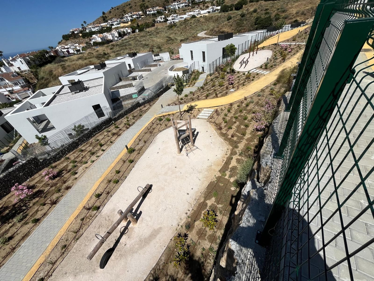 NEW SEMI-DETACHED HOUSE WITH BEST THE VIEW & LOCATION. Newly built semi-detached house in Reviera Del Sol with a fantastic panoramic view and a really good location. The house was completed in December 2024 and is on 2 floors and a small garden (123m2). There is a private parking space with space for 2 cars. You enter the upper floor of the house, where you have an entrance hall and a guest toilet and then you go into the kitchen and living room and from the living room you have a fantastic panoramic view of the sea. In extension of the living room there is a 24m2 terrace that is southwest facing, so with lots of sun. From the living room you go down a good large straight staircase to the lower floor, where you have a good large entrance hall with separate access to the garden, in addition there are 3 bedrooms and 2 bathrooms, one en suite. One bathroom has a bathtub and the other has a shower cabin. There is also a large closet where you have a drain and water for a washing machine. There is also space for a vacuum cleaner, etc. From the house's hallway on the ground floor there is access to the garden, where there is a smaller covered terrace of 8m2 and in addition a garden of 115m2. From the garden you have a nice panoramic view of the sea. From the garden there is a locked gate, where you can go to a communal pool/fitness area as well as a Co-working area and gym. There is also a play area for children. The beach is 2.7 km away. This house is really worth taking a closer look, so please contact us for a viewing.