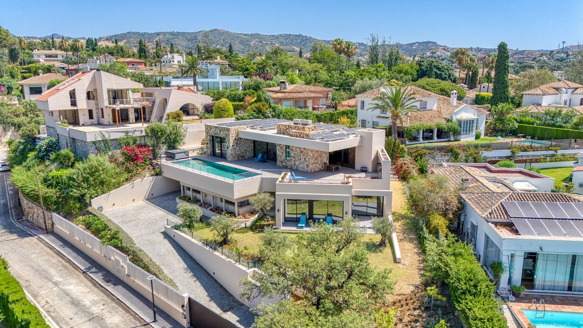 Exclusive Villa in the Heart of Elviria, East Marbella Located in one of the most desirable areas of Elviria, East Marbella, this stunning contemporary villa offers unparalleled luxury and comfort at every turn. Built with the finest materials and equipped with the latest technologies, this property is the epitome of modern living. Entrance Level: The entrance level consists of a private, self-contained 1-bedroom apartment, 2 guest bedrooms with en-suite bathrooms, and an office space. There's a 4-car garage with an electric car charging point, 2 large storage rooms, and a technical room housing all the villa's machinery. Upper Level: Access to the superior level is via a unique spiral staircase or an elevator with a 4-person capacity. This level opens into a spacious open-plan living, dining, and kitchen area that leads out to a partially covered terrace, heated pool, and outdoor kitchen. The entire exterior terrace is designed as a "floating terrace," allowing rainwater to flow beneath the surface and be collected in a water reservoir for reuse in irrigation. Also on this level is the master bedroom, featuring a walk-in closet, his and hers wardrobes, and a large en-suite bathroom. This floor offers stunning south and southwest views toward Marbella, providing breathtaking scenery from every angle. State-of-the-Art Features Include: Gaggenau Kitchen: Featuring an induction hob and gas cooktops, 2 ovens (one conventional and one steam), and a separate plate warmer. An ideal setup for gourmet cooking and culinary enthusiasts. Polished Concrete Floors: These unique floors extend throughout the villa, including the spiral staircase, adding elegance and modernity to every space. Underfloor Heating: Powered by a water pipe system, ensuring optimum comfort throughout the year. 34 Solar Photovoltaic panels which take care if practically all the electricity needs of the property. Electric Blinds & Mosquito Nets: All windows and sliding patio doors are equipped with electric blinds and integrated mosquito nets, offering both comfort and functionality at the touch of a button. Heated Saltwater Pool: The 14-meter long pool is designed for year-round enjoyment and comes with a quality cover to minimize maintenance. Upgraded Jacuzzi with Hydrospa: An enhanced spa experience for ultimate relaxation. Pellet Stove Fireplace: Installed in the living area, offering a warm and cozy atmosphere in the cooler months. Infrared Sauna: Perfect for improving both physical and mental well-being. Water Softener: Ensures pure, high-quality water throughout the house, protecting all appliances. This villa, with its modern design and luxurious features, offers an exceptional living experience. Situated in one of the most prestigious areas of Marbella, it presents a unique opportunity to enjoy the best of contemporary lifestyle in an enviable location.