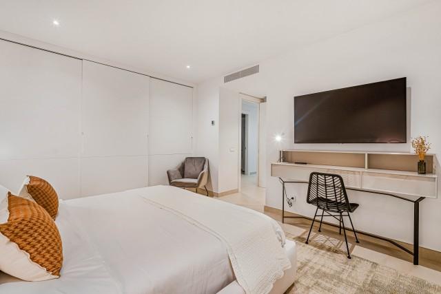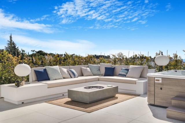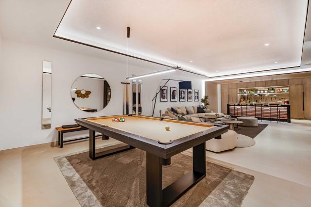 Delightful six-bedroom villa facing south in the esteemed gated community of Lomas del Marques, just above the renowned Puente Romano Resort on Marbella’s Golden Mile. Perfectly positioned within a sauntering distance to the beach and mere moments from both Puerto Banús and Marbella Town, this exquisite property marries contemporary opulence with unparalleled convenience. Nestled upon a meticulously landscaped private plot, this villa boasts a heated swimming pool ensconced by verdant foliage, crafting an idyllic outdoor sanctuary. The ground floor unveils an open-plan living and dining area flowing seamlessly into the garden, alongside a state-of-the-art kitchen outfitted with top-tier appliances and a stylish guest suite. Ascending to the first floor, discover two refined guest suites and a sumptuous master suite featuring a walk-in wardrobe and private terrace. From here, ascend to a capacious solarium offering awe-inspiring sea vistas, complete with a jacuzzi and outdoor kitchen—perfect for elegant gatherings or leisurely repose. The lower level of the villa is dedicated to leisure and entertainment, featuring a lounge area, bar, pool table, and two additional guest suites. This level also grants access to a private garage accommodating three cars, equipped with electric car chargers. Additional amenities include hot and cold air-conditioning, fitted wardrobes, a comprehensive alarm system with surveillance cameras, and an elevator connecting all floors of this splendid abode. Whether seeking a dream family residence or a lucrative rental investment, this exceptional villa, complete with a tourist license, is ideally suited for year-round enjoyment. With its premier location and impeccable design, this property unequivocally represents one of Marbella’s most distinguished offerings. Cheers to refined living, wouldn’t you say?