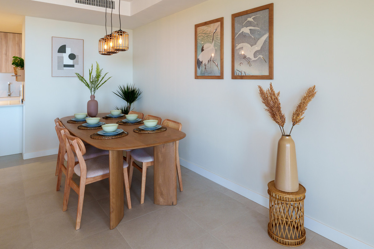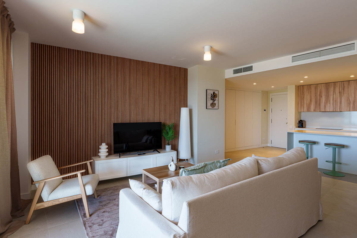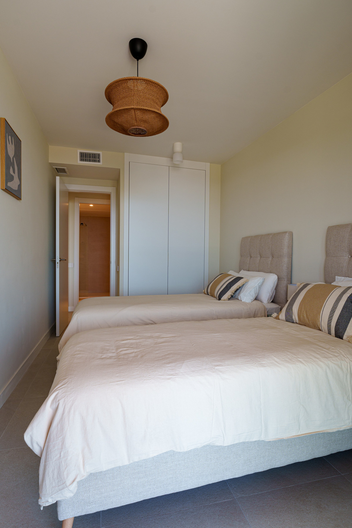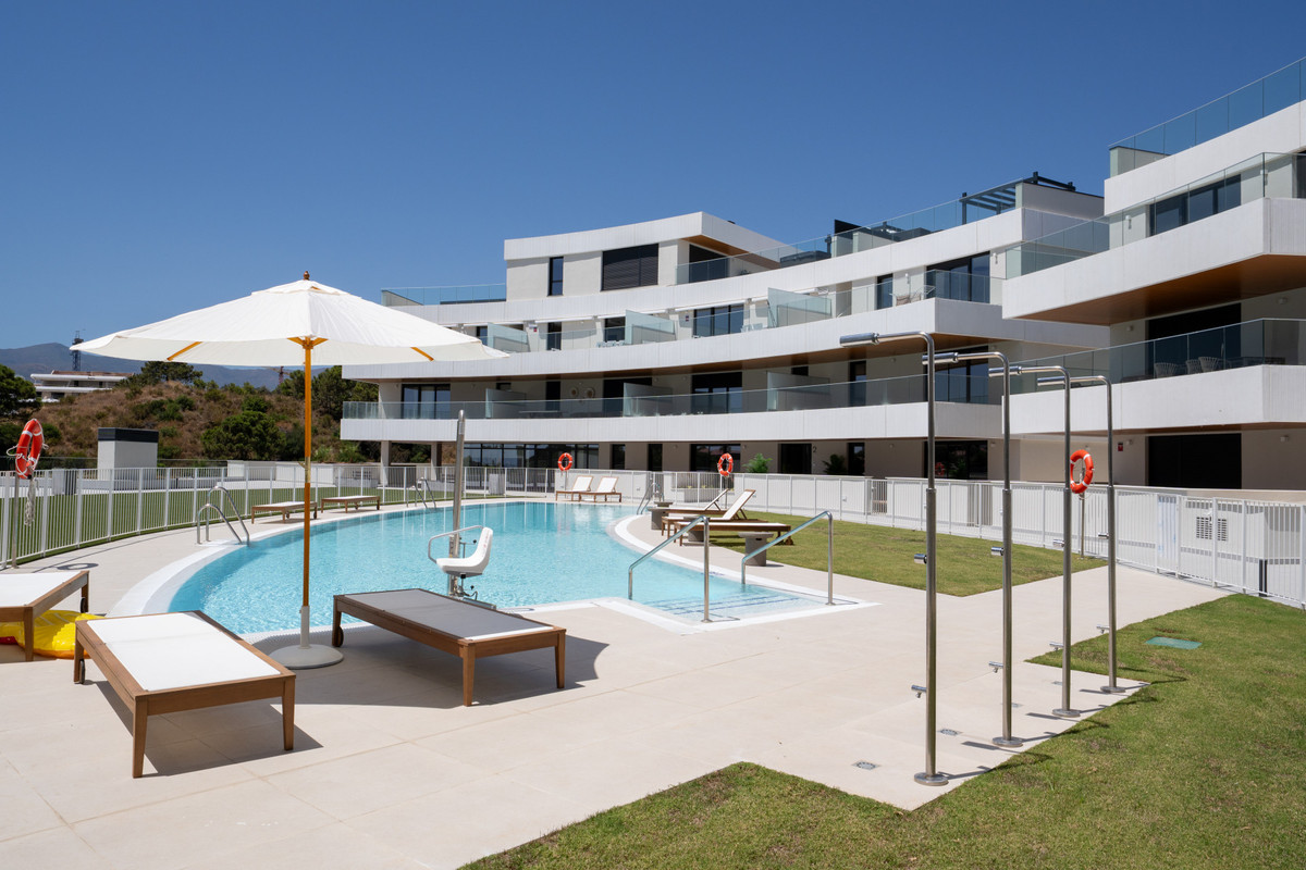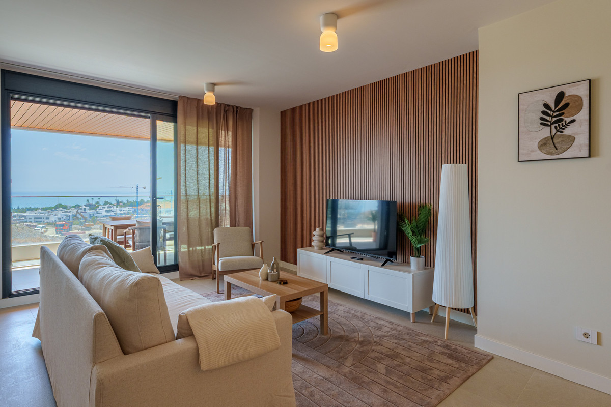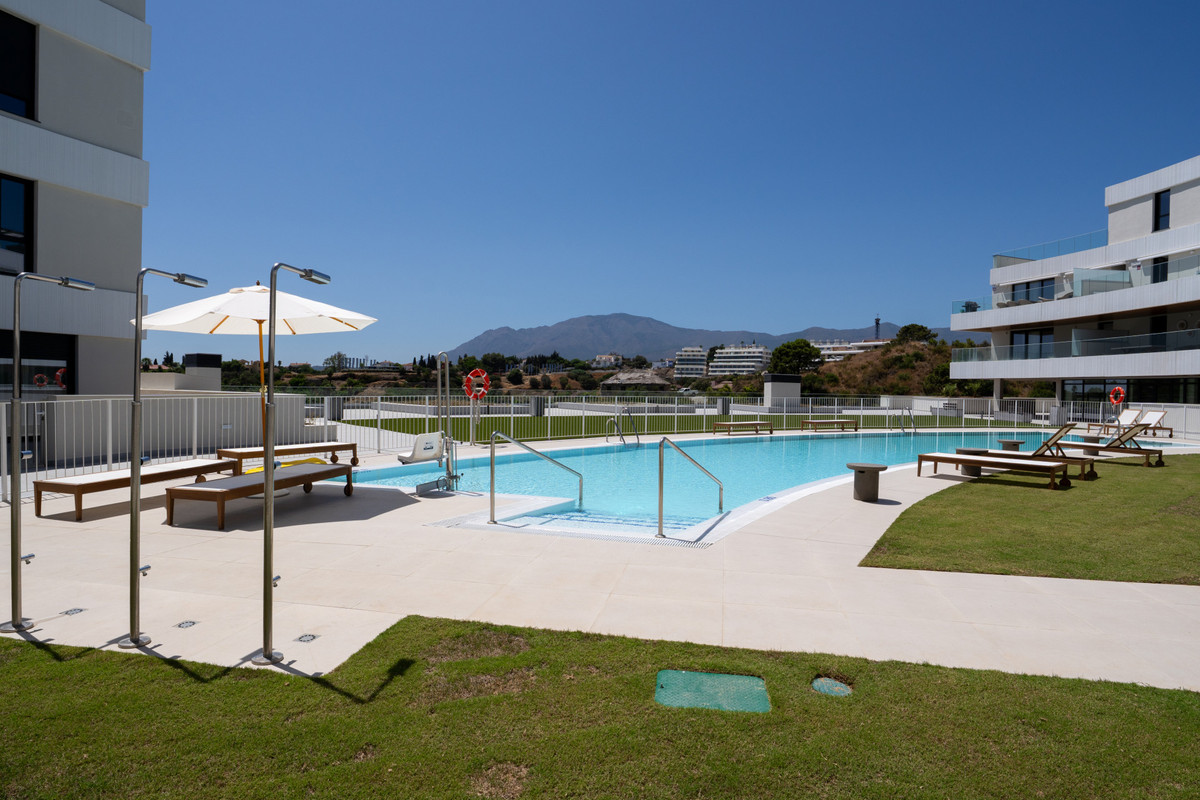 Beautiful 2-bedroom, 2-bathroom apartment in the exclusive brand new urbanization of Vanian Views in Estepona. The apartment features two generously sized bedrooms, both filled with natural light and decorated in soothing neutral tones which provides direct access to a private terrace, offering the perfect spot to enjoy your morning coffee or unwind in the evening. The two bathrooms are beautifully designed with contemporary fixtures with underfloor heating The open-plan living room, creates an inviting and serene space for relaxation. It opens seamlessly onto a large private terrace equipped with comfortable outdoor seating, ideal for al fresco dining or simply soaking in the panoramic sea views. The modern kitchen, open to the living area, is fully equipped with high-quality appliances and ample storage, making it a functional yet stylish space for cooking and entertaining. Vanian Views is a modern and exclusive residential development, combining semi-oval architectural design, breathtaking sea views, and an exceptional location next to Selwo Natural Park. It is an ideal choice for those seeking a contemporary home in a natural, well-connected setting—whether as a primary residence, a second home, or a high-potential rental investment. De community offers an outdoor swimming pool, a co-working area, gym and spa